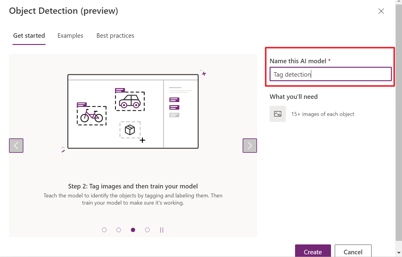 - >> 15 Imágenes mínimo por elemento que queremos detectar (necesario para crear el modelo), pero Microsoft recomienda hasta 50 para que el modelo tenga buena fiabilidad. El conjunto de imágenes lo identificaremos como "data set".